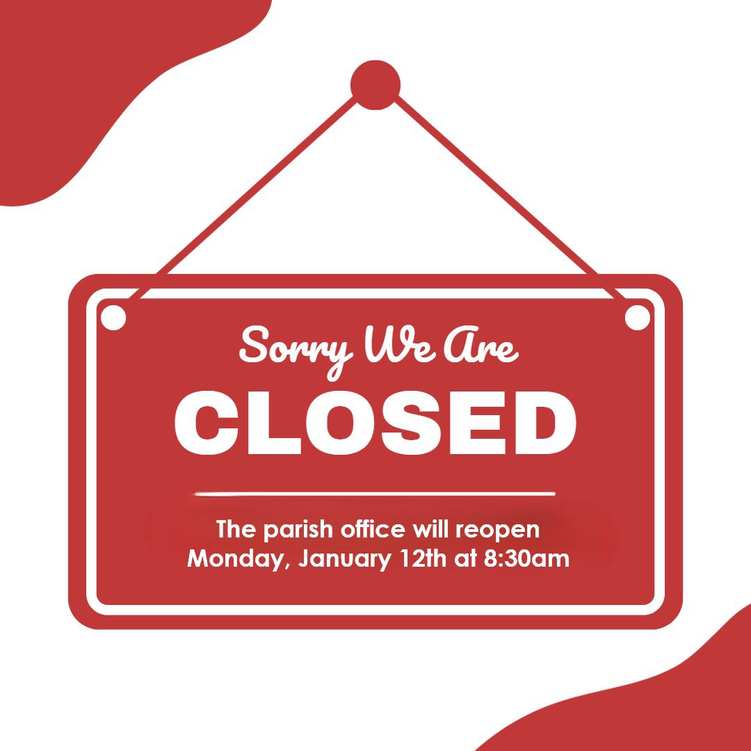 The parish office will be closed Friday, January 9th and will reopen on Monday January 12th. We apologize for any inconvenience.